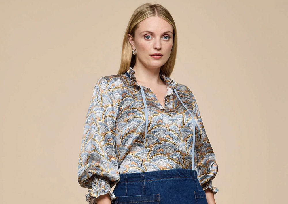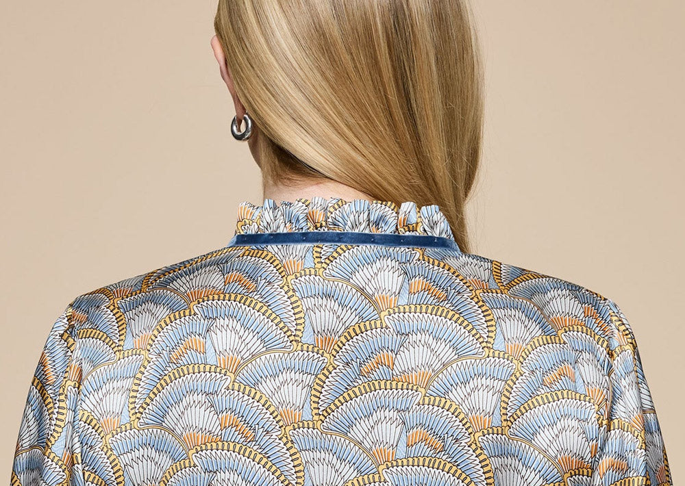 This Icarus Wing Print Silk Blouse has long sleeves with shirred elastic frilled cuffs. The frilled neckline is drawn together with a contrasting velvet ribbon, creating a subtle and pretty keyhole on the décolletage.