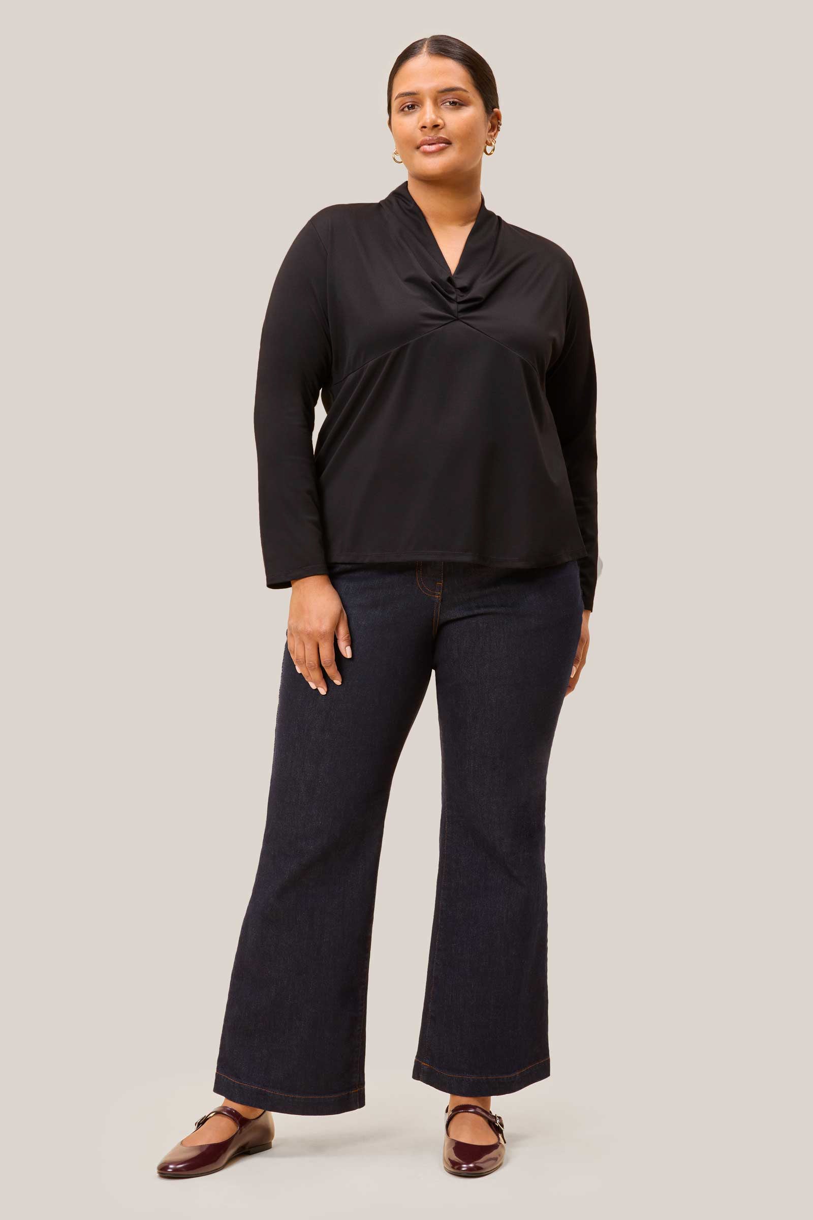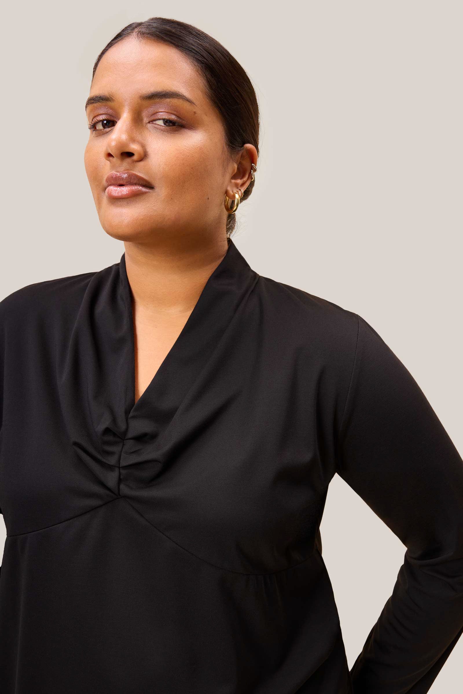 A timeless essential with a refined finish. The Jersey V-Neck Top in Black is crafted from a soft, fluid jersey designed to drape beautifully over the body. Featuring a softly gathered V-neckline and long sleeves, it creates a clean, elegant line that flatters the bust while offering ease through the waist and hips.