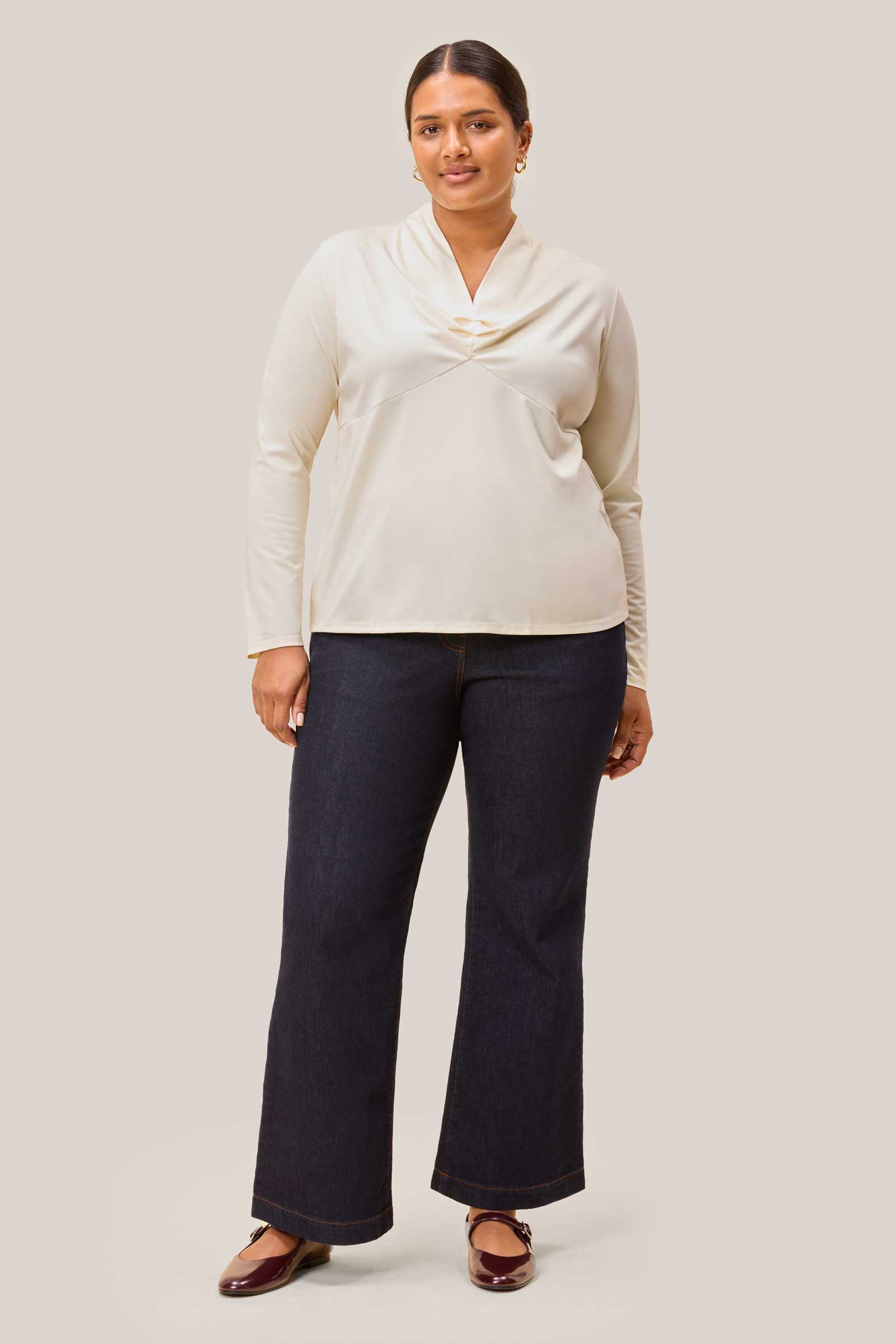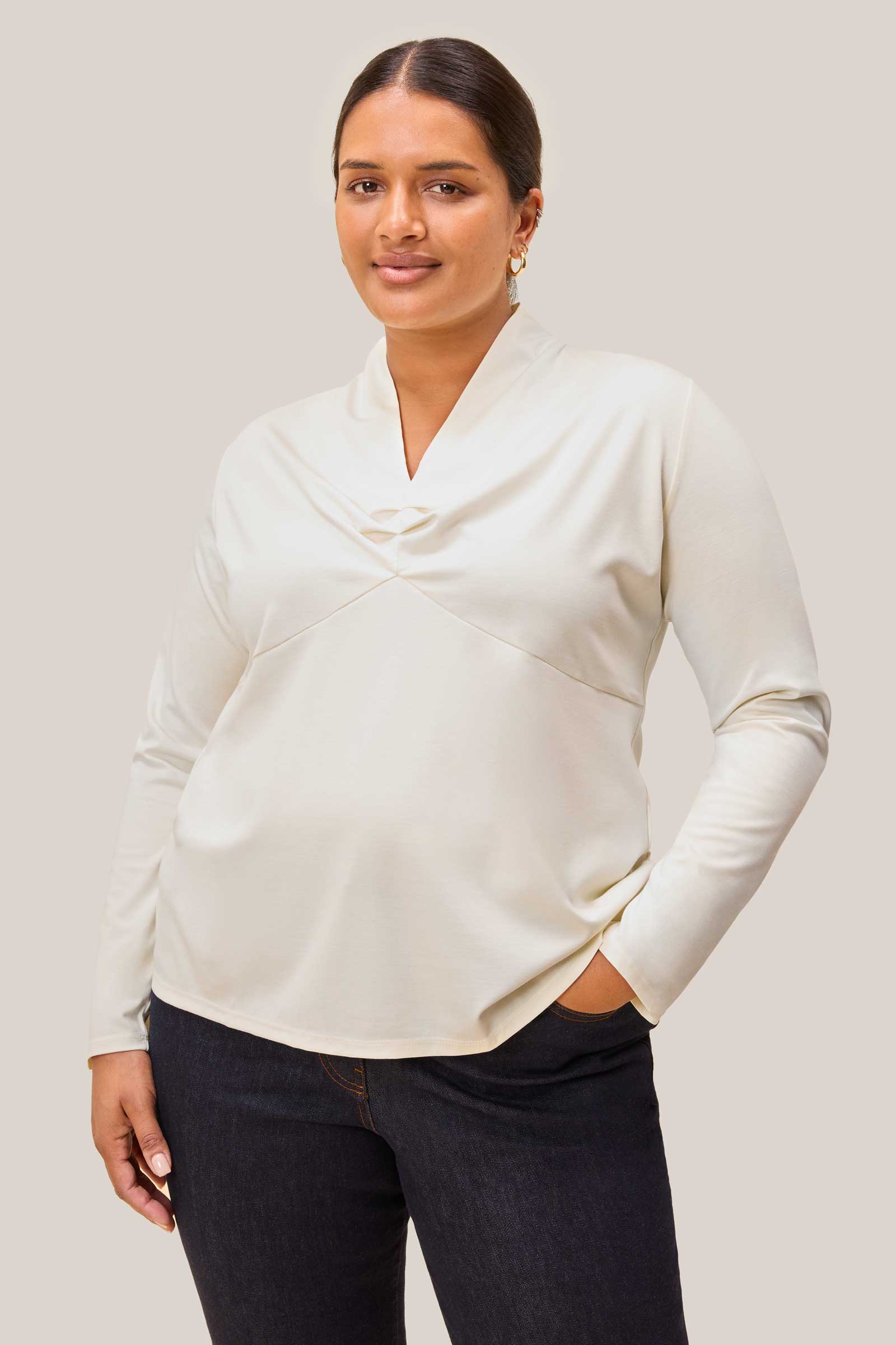 The Jersey V-Neck Top – Cream is an effortlessly elegant wardrobe staple. This long-sleeve jersey top in soft cream combines comfort with refined design. The draped V-neckline flatters the décolletage while creating subtle structure through the bust, giving the silhouette gentle definition without cling.